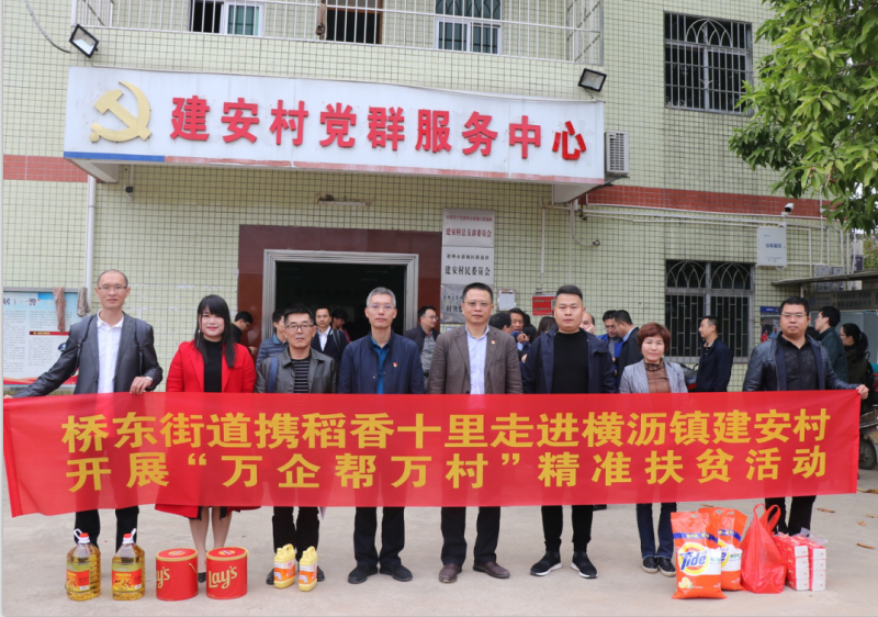 2020年1月2日,为全面贯彻落实党的十九大精神,进一步落实精准扶贫工作要求,引导广大非公经济人士不忘初心、回报社会,充实丰富“万企帮万村”精准扶贫行动,使广大贫困群众感受到党和政府以及企业家温暖和关爱,进一步提升获得感、幸福感和安全感。桥东街道党工委书记李伟强同志带队,到挂点横沥镇建安村开展2019年“万企帮万村”精准扶贫活动,稻香十里作为广东省桥东互联网+商创小镇成员企业之一与多家爱心企业一起积极参与为贫困群众送去新春关爱和新年祝福。