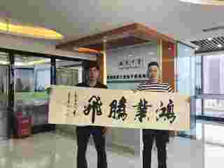 书画家李斌为惠州市河南南阳商会惠州稻香十里电子商务有限公司送来墨宝“鸿业腾飞”交到曲清军会长手中。李斌,号空子,业界美誉“隶书李”,1966年出生于河南。现任中国书画艺术研究会会员、河南省分会理事,豫南书画院副院长,阿克苏书画家协会会员,深圳清风书画艺术研究院特邀顾问。