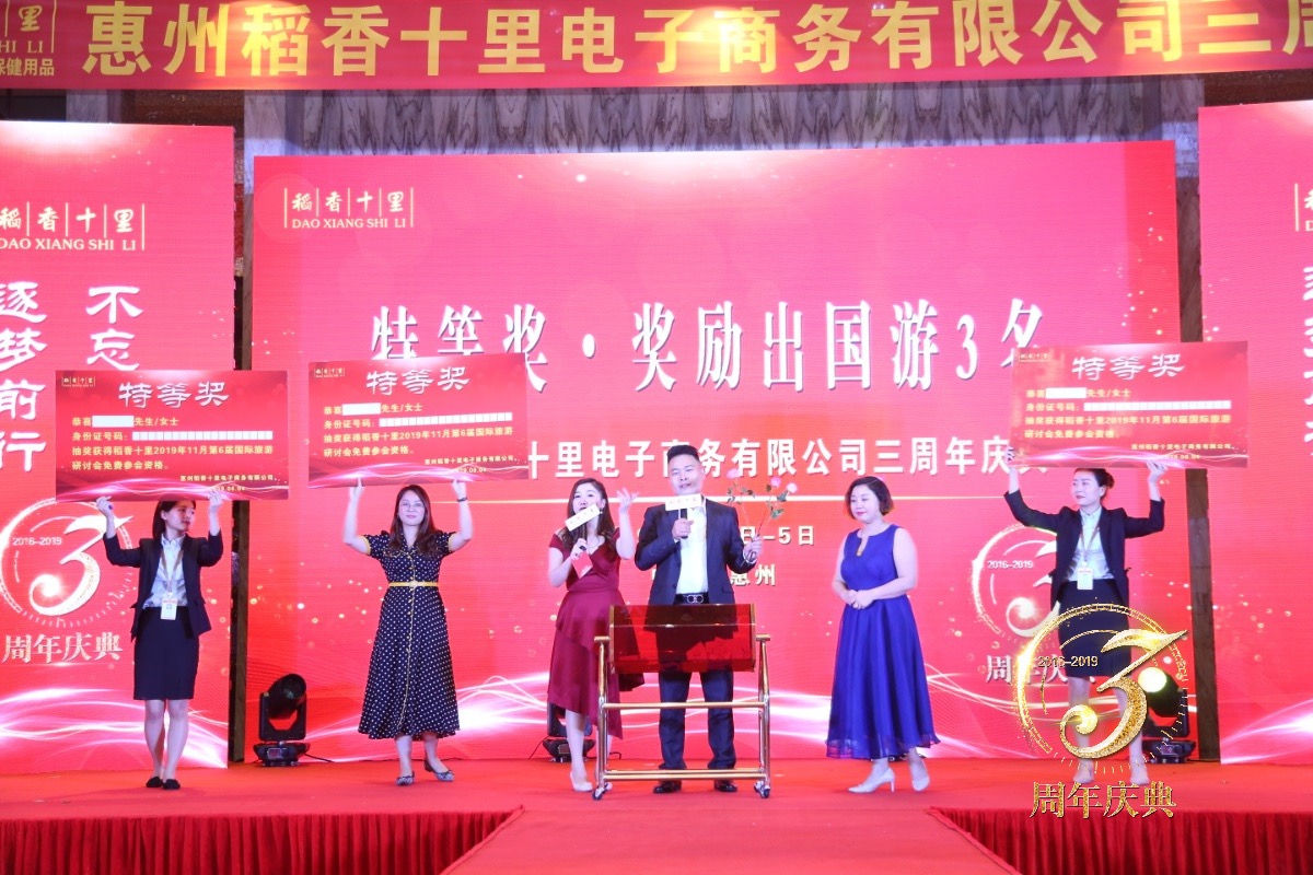 2019年6月3日,惠州稻香十里电子商务有限公司三周年庆典在惠州白鹭湖喜来登五星级酒店隆重举行,稻香十里董事长曲清军、总经理李玲、策略委员张忆苗、许英如、潘勇斌、黄智煌、杨玉芬、叶霞珍、蔡牡丹、刘芸芸等全国优秀代理商共300余人出席庆典大会。
