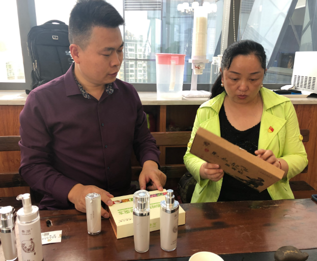 稻香十里董事长曲清军向贵州省织金县招商局张颖主任介绍系列产品