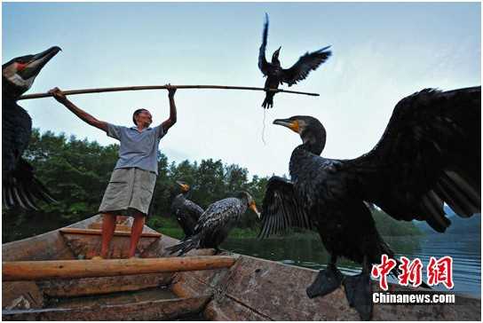 胡锦涛总书记2005年8月两次就“锰三角”污染问题,作出重要批示,一场环保风暴直刮“锰三角”。湖南省花垣县、贵州省松桃县、重庆市秀山3县共同联手整治锰矿污染,经过7年的综合治理,如今的清水江河水清澈见底,老百姓又能在河中洗衣洗菜洗澡了。图为花垣县边城镇鱼民曾祥书近日在清水江上用鱼鹰捕鱼。