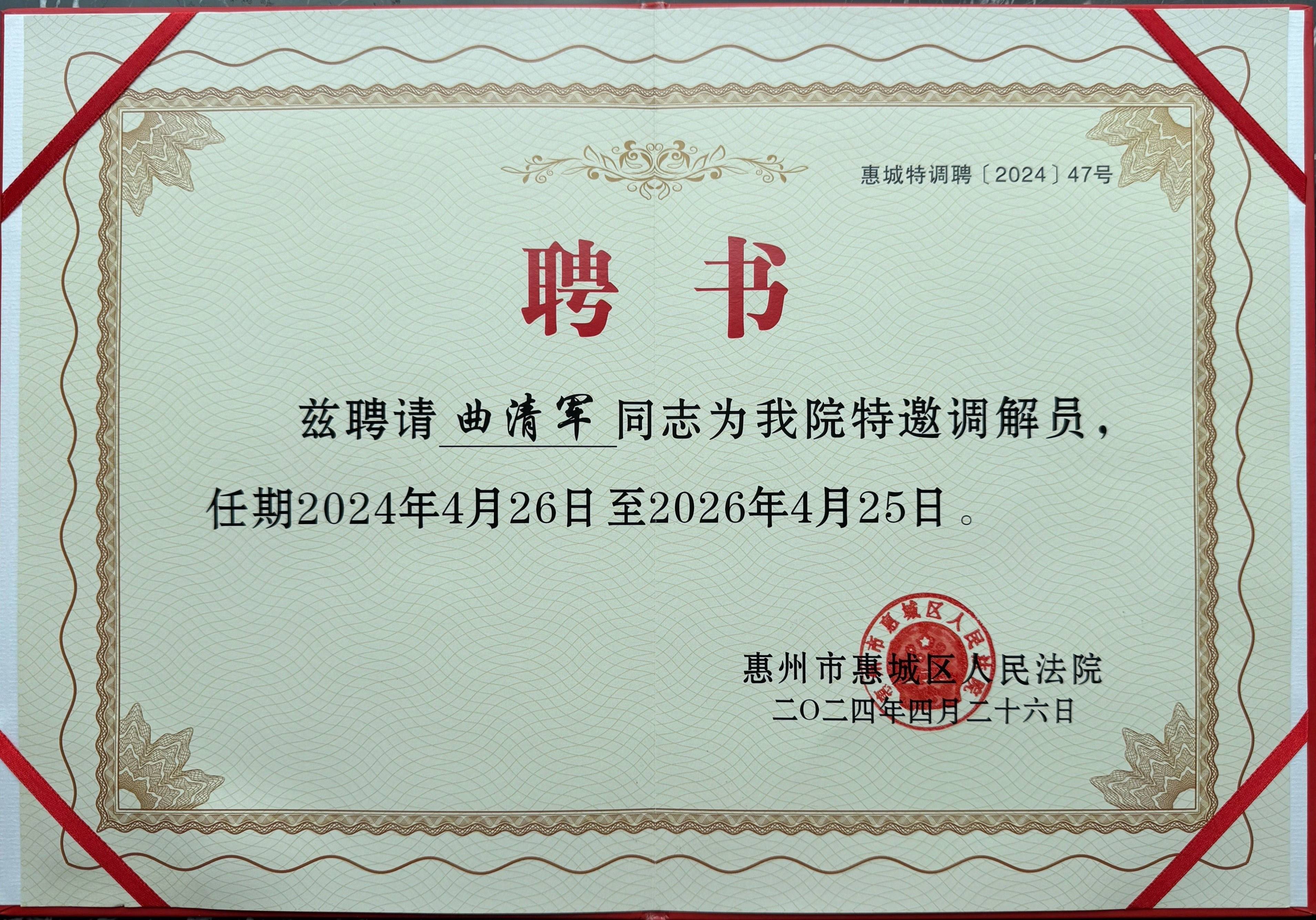 曲清军同志获聘惠州市惠城区人民法院“特邀调解员”